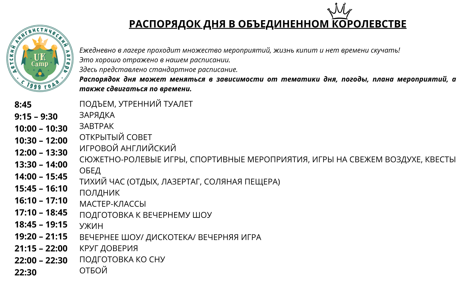 «Объединенное Королевство» — это волшебная страна для детей от 6 до 17 лет со своей историей и традициями, которые мы бережно храним с 1999 года.